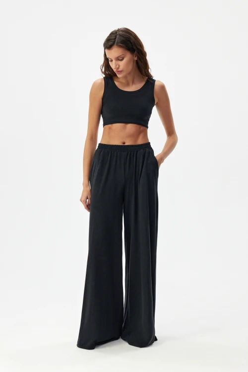Стильные широкие трикотажные брюки чёрного цвета — незаменимая вещь в гардеробе современной женщины. Мягкая кулирная гладь дарит приятную на ощупь текстуру и аккуратный, ухоженный вид. Широкая мягкая резинка в поясе позволяет легко регулировать посадку: носите модель на талии или чуть ниже в зависимости от ситуации и настроения. Размер 44-46, рост 176.