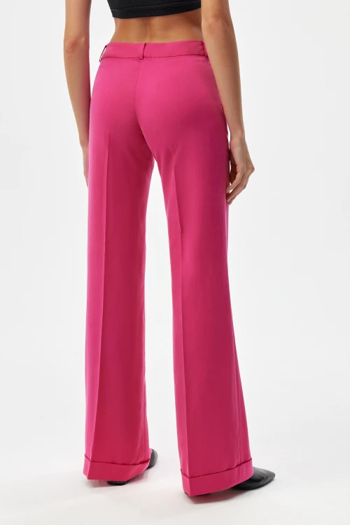 Изысканные брюки фуксия с заниженной талией на широком плотном поясе — сочетание чёткого кроя и насыщенного оттенка. Модель плотно сидит в области бёдер и мягко расклёшивается книзу, визуально удлиняя ноги и придавая силуэту динамику. Широкие манжеты внизу добавляют актуальный акцент и позволяют легко адаптировать образ к различным ситуациям. (размер 46, рост не указан)