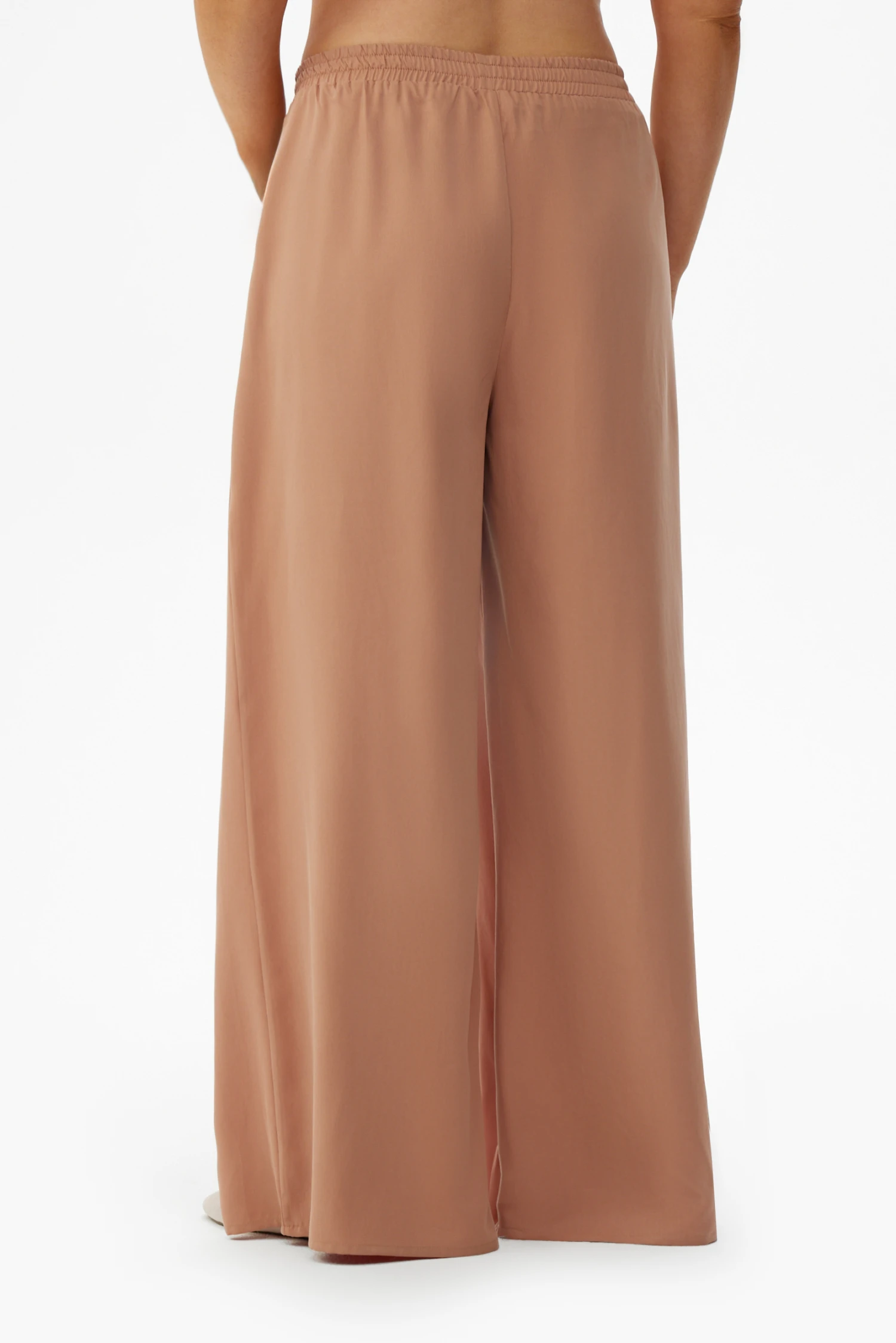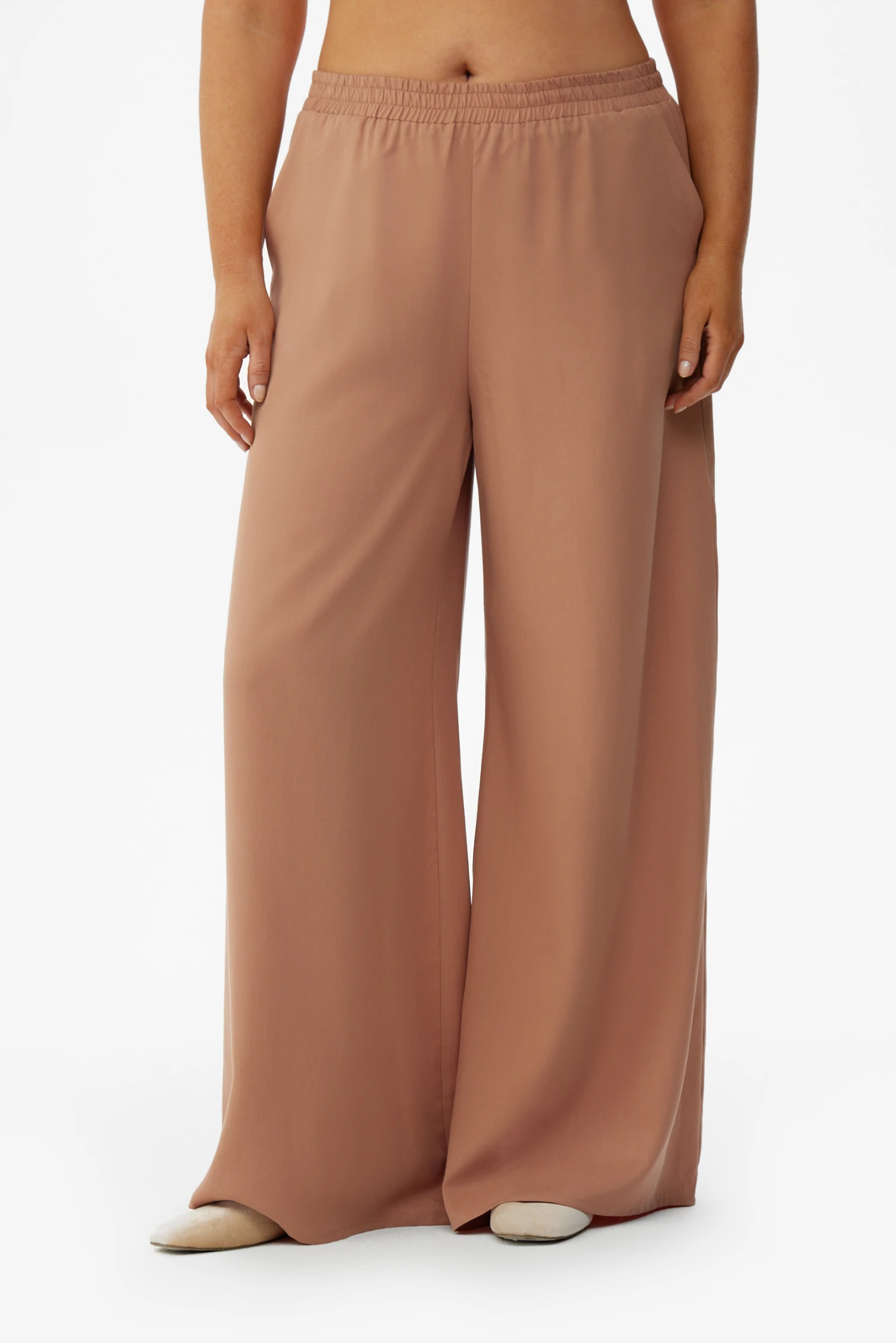 Изысканные широкие брюки песочного оттенка — базовая вещь для современного гардероба (размер 48-50, рост 170). Свободный крой обеспечивает комфорт при продолжительном ношении, а мягкая эластичная резинка на поясе аккуратно прилегает, не нарушая силуэт. Удобные боковые карманы добавляют практичности, не перегружая внешний вид.