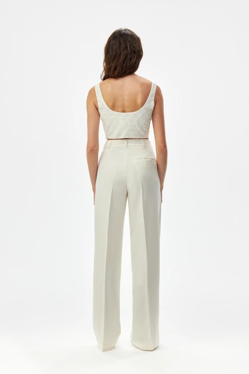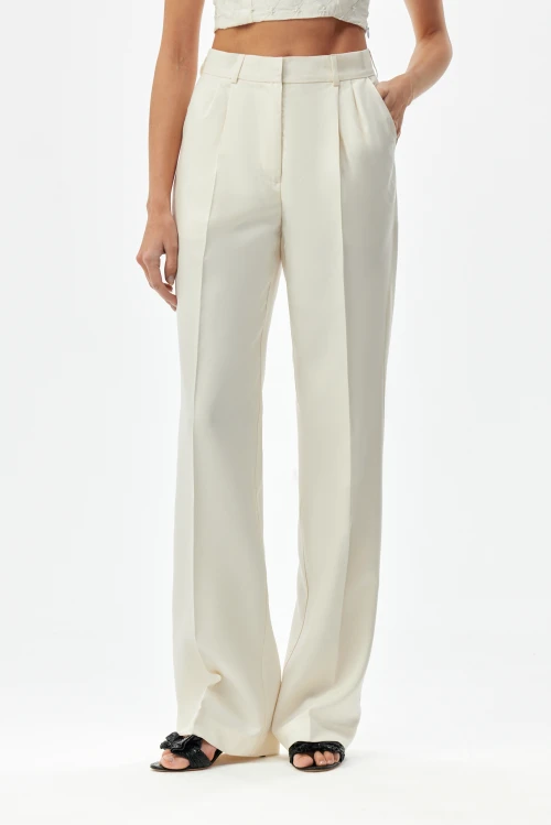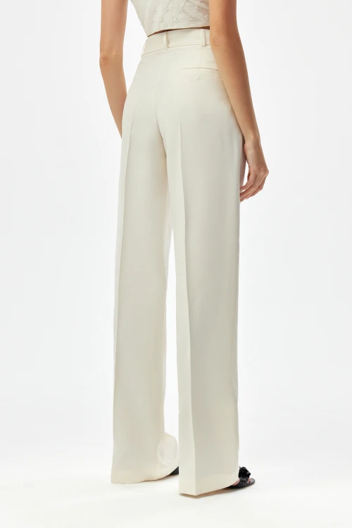 Изысканные брюки прямого кроя в мягком молочном тоне, сшитые из итальянского шерстяного полотна с добавлением дикого шелка. Неровная фактура шелка придаёт лёгкую текстурность и небольшой эффект расслабленной небрежности, благодаря чему модель уместна как в строгих, так и в более свободных сочетаниях. Вариант представлен в размере 46, рост 170.