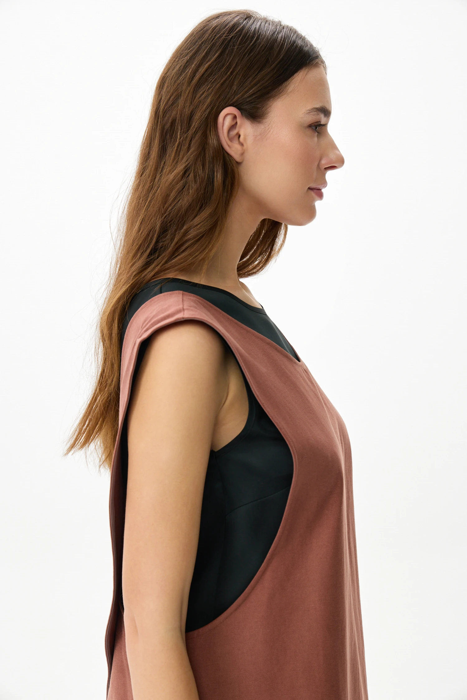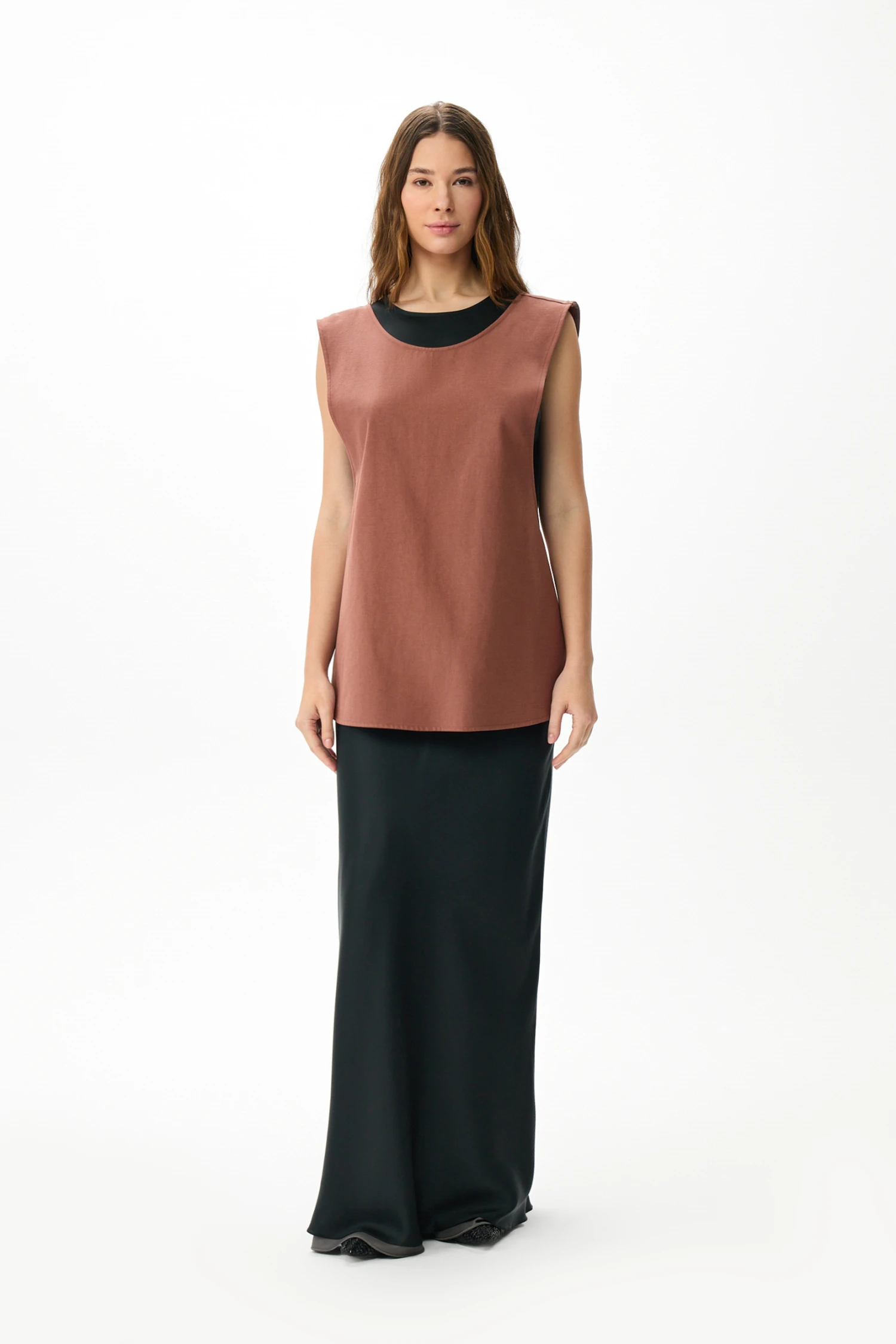 Строгий фартук‑жилет спокойного терракотового тона объединяет практичность и тщательную проработку деталей. Выполненный из плотного материала, он эффективно предохраняет одежду от брызг и пятен при готовке, творчестве или работе в мастерской. Простая конструкция, надеваемая через голову, обеспечивает лёгкость использования, не ограничивая свободу движений и сохраняя чистую линию силуэта. Размер 40–46, рост — универсальный.