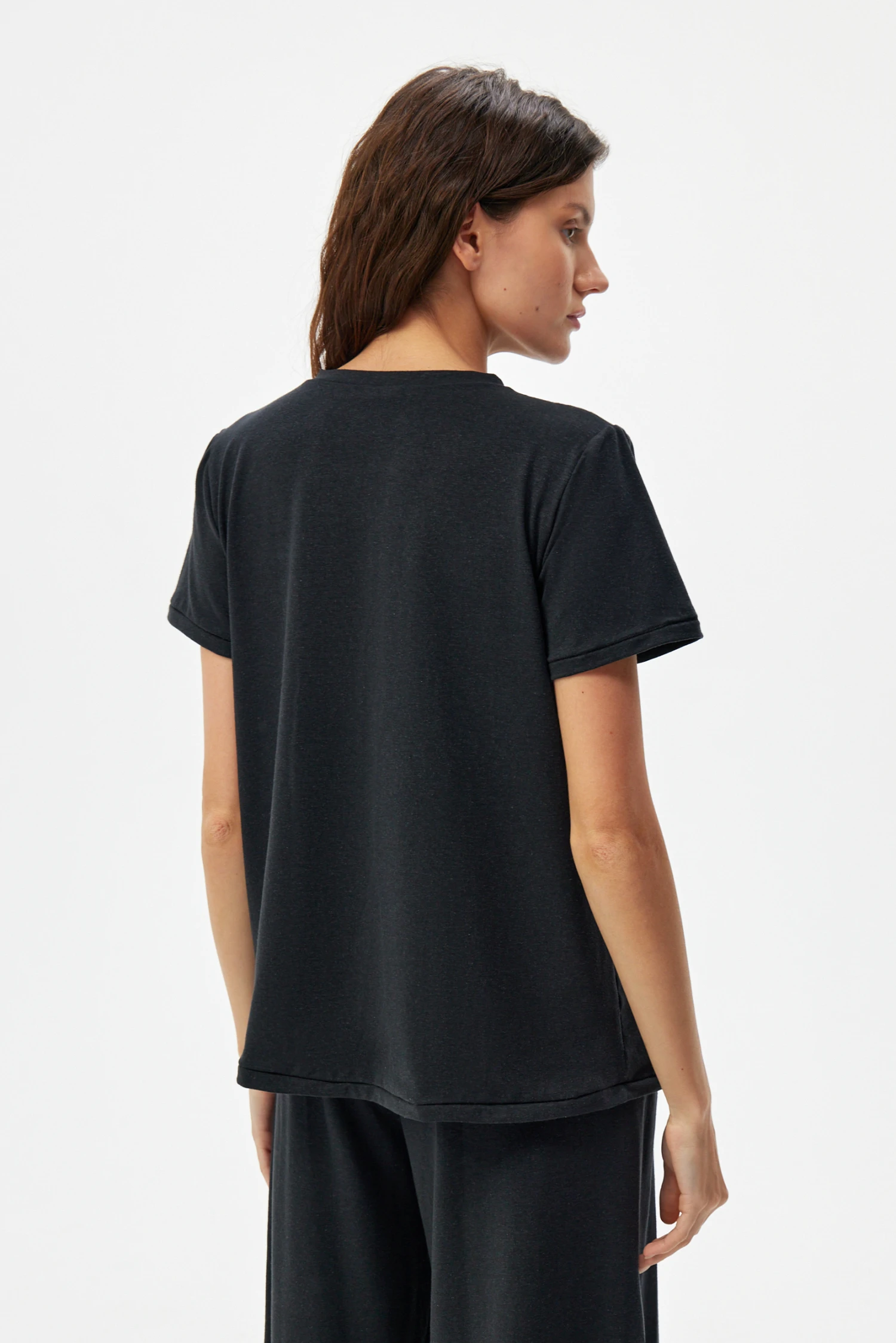 Чёрная базовая футболка для уверенных в себе женщин, которые предпочитают сдержанную эстетичность и практичность. Глубокий чёрный тон делает вещь универсальной — она одинаково хорошо смотрится отдельно или в многослойных сочетаниях под пиджак или кардиган (размер 42, рост 42).