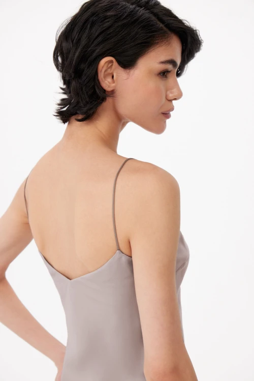 Вырез на спине выполнен так, чтобы сорочку можно было носить с бюстгальтером; бретели тонкие, без классических регулировок, но с технологическим запасом длины для аккуратной подгонки. Крой не ограничивает движения и мягко подчёркивает силуэт, создавая деликатную женственную драпировку.