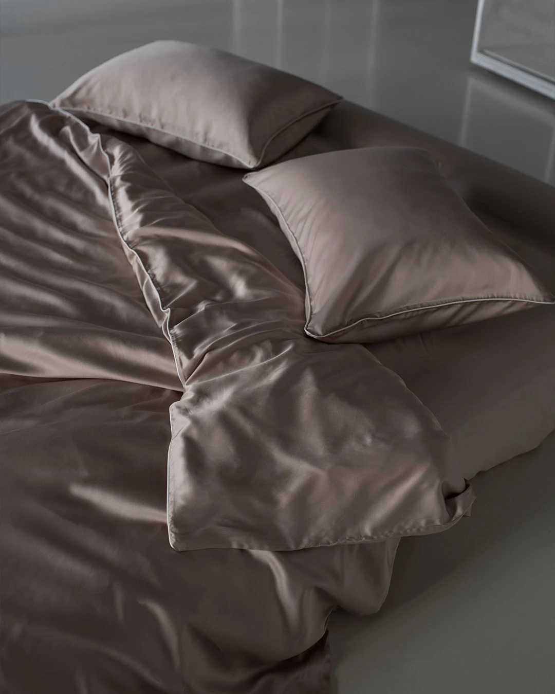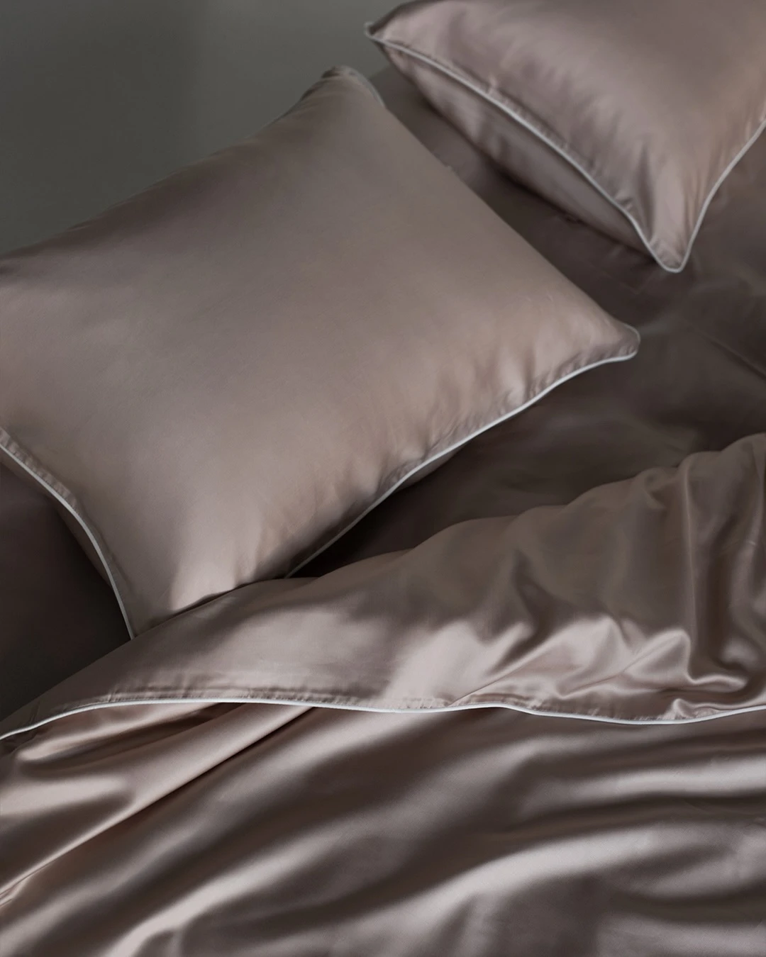 Ткань тенсель отличается мягкой шелковистой текстурой, которая после стирки приобретает лёгкую бархатистость, делая прикосновения особенно комфортными. Материал эффективно отводит влагу, остаётся дышащим, не электризуется и не скользит, что обеспечивает уютный и спокойный сон даже при повышенной чувствительности кожи.