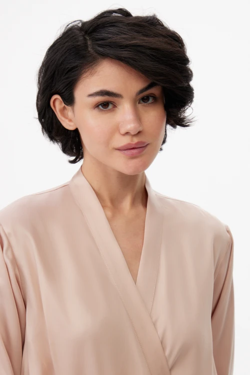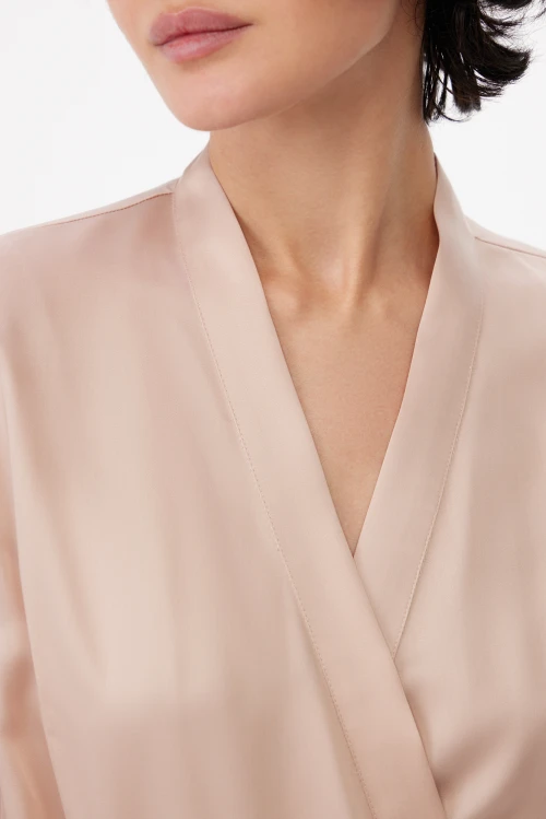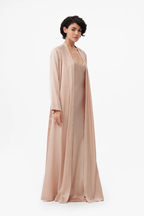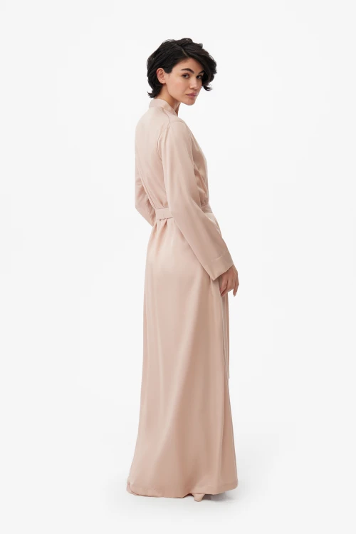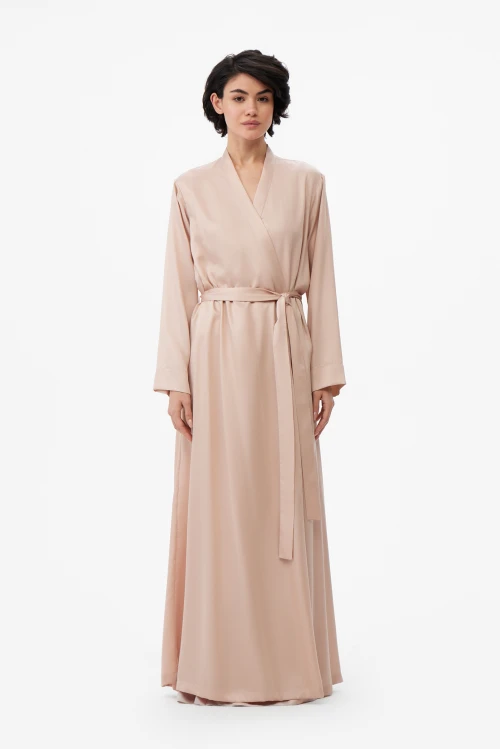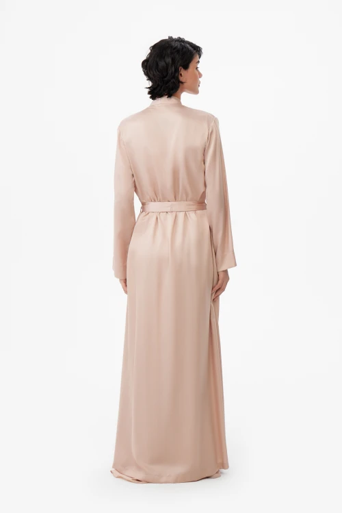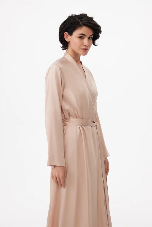 Конструкция продумана до деталей: скрытые завязки внутри и удлинённый пояс надёжно фиксируют запах и обеспечивают аккуратную посадку без лишних элементов. Такой фасон одинаково уместен как лёгкий домашний халат для утренних ритуалов, так и как элегантная накидка при подготовке к важному выходу.