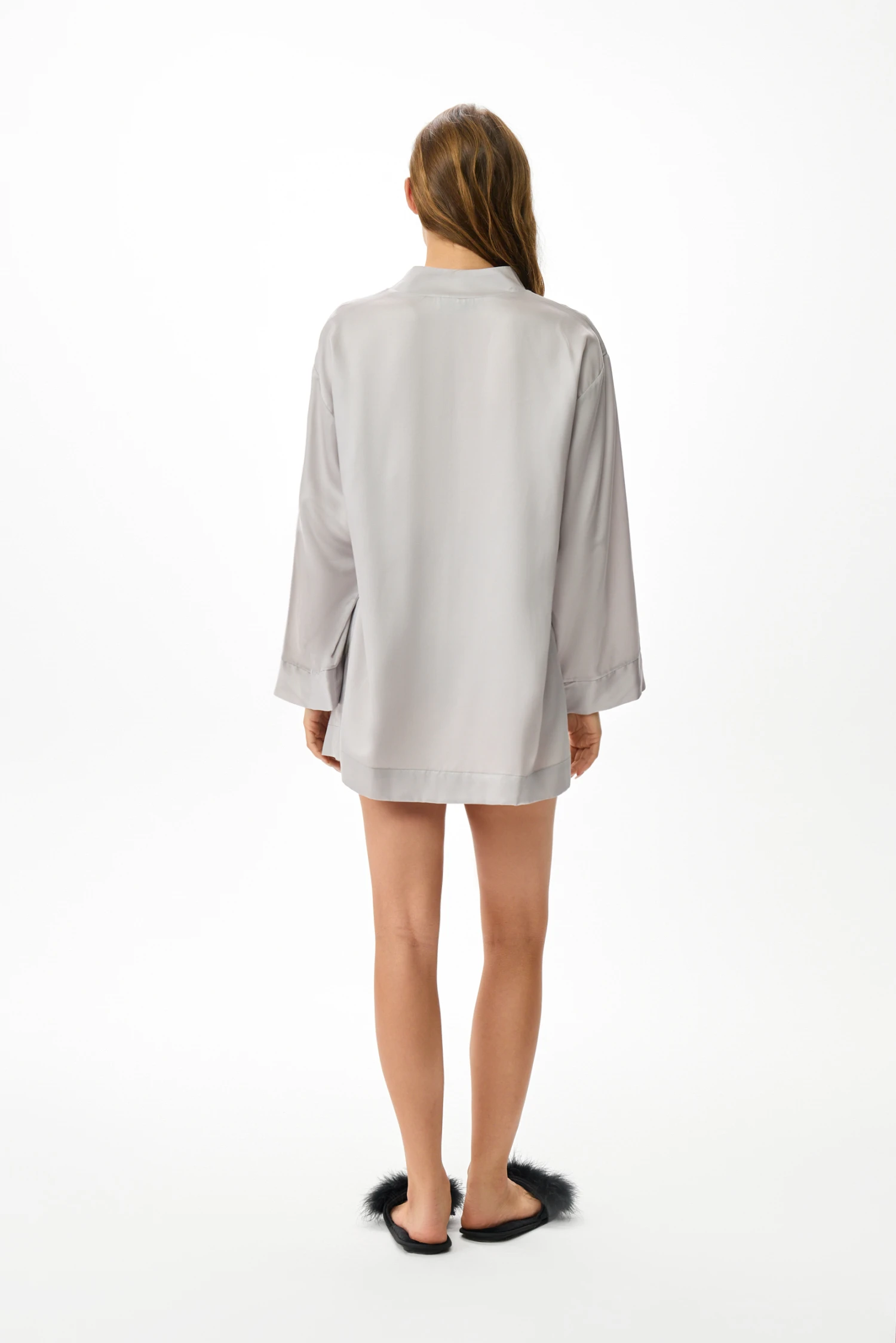 Пеньюар в духе японской минималистики в нежно-сером оттенке объединяет простую элегантность и продуманную практичность. Сдержанный силуэт и аккуратная отделка делают модель уместной и для уютного дома, и для неспешных городских прогулок в паре с брюками из коллекции Wibe. Размер 40-44, рост 158-164.