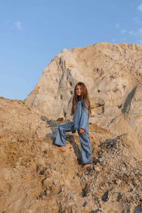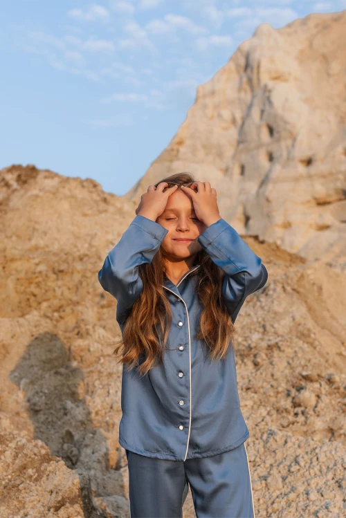 Изящная детская пижама глубокого синего оттенка в духе Old Money — отличный выбор для тех, кто ценит сдержанную роскошь и высокое качество. В наборе — удлинённая рубашка, которую можно носить как самостоятельный элемент гардероба, и просторные брюки с удобными карманами и широкой мягкой резинкой, не давящей на живот. На фото виден светло-розовый кант; в карточке товара доступен выбор других цветов отделки. Размер 110, рост 110 см.
