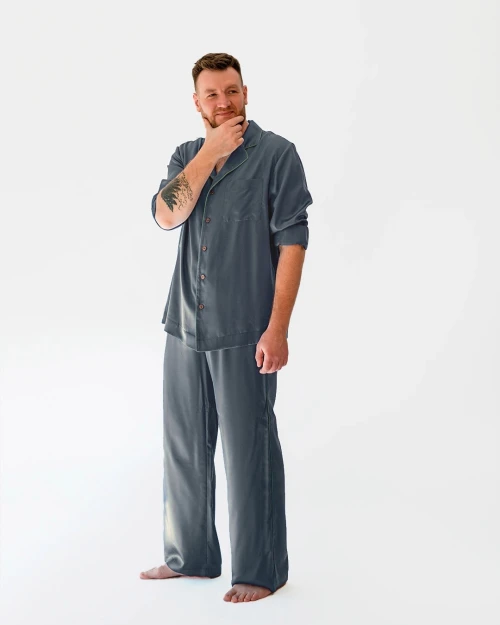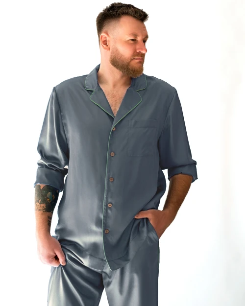Стильная синяя пижама из тенселя с изящной зелёной отстрочкой — гармония сдержанного образа и продуманного комфорта для взыскательной женщины. Нежная натуральная ткань приятна к коже, мягко облегает силуэт и создаёт ощущение уюта как для спокойного сна, так и для расслабления дома или в поездке. Размер 52-54, рост 182 см. Контрастная зелёная окантовка добавляет аккуратную деталь, подчёркивающую внимание к стилю и качеству.