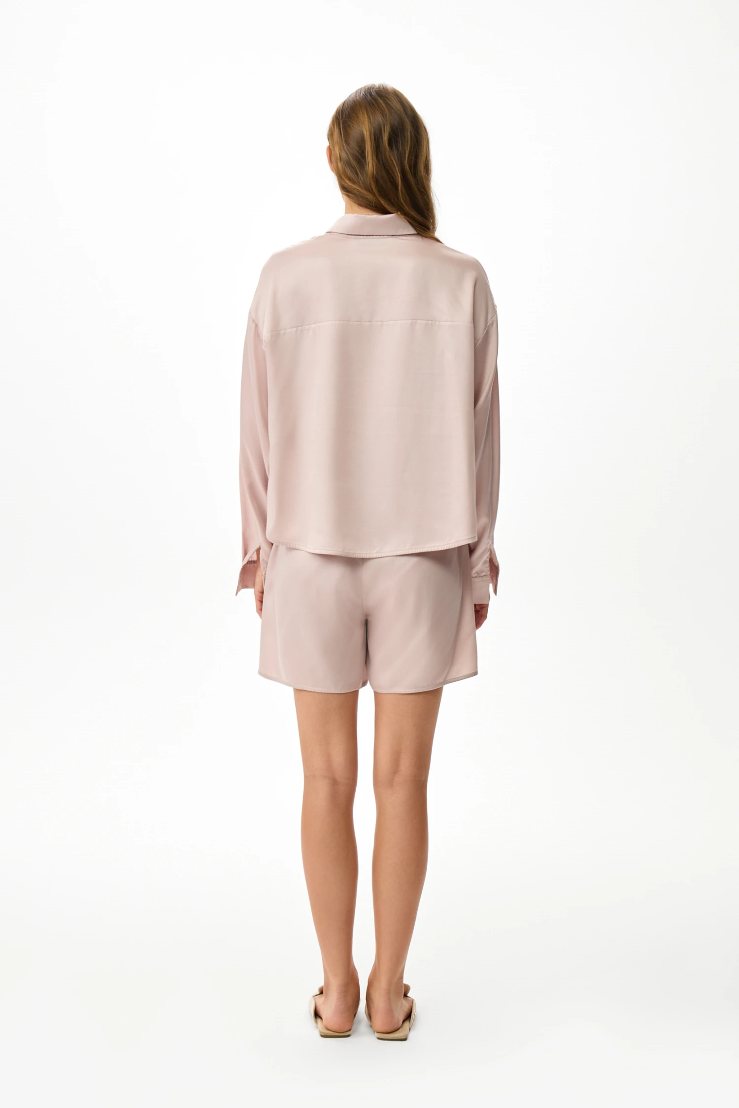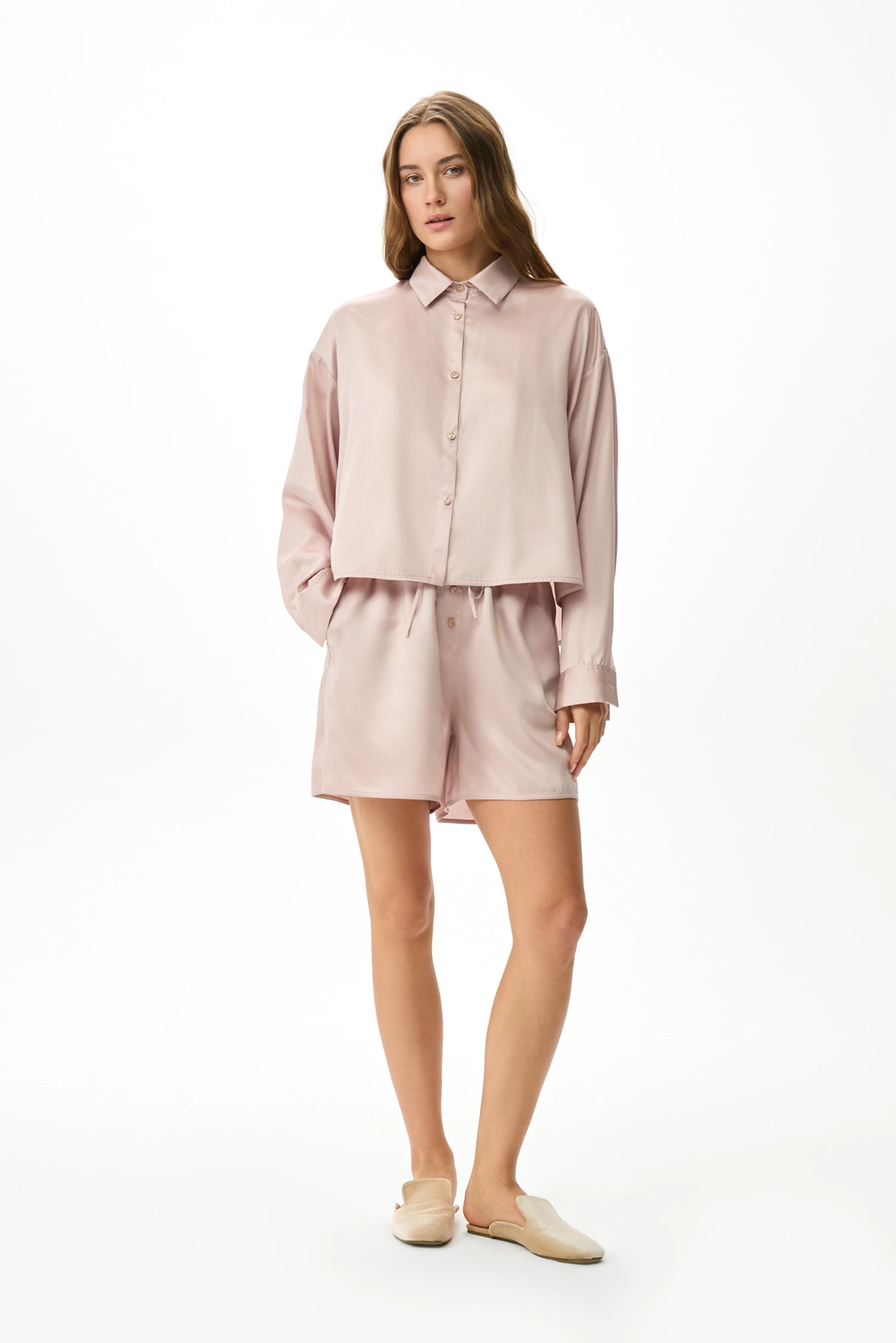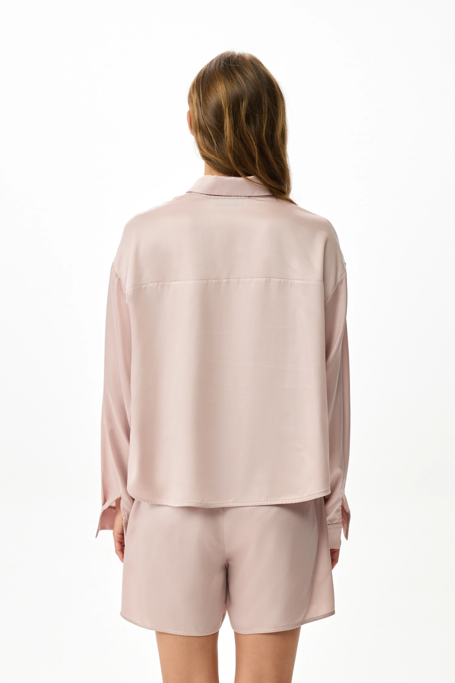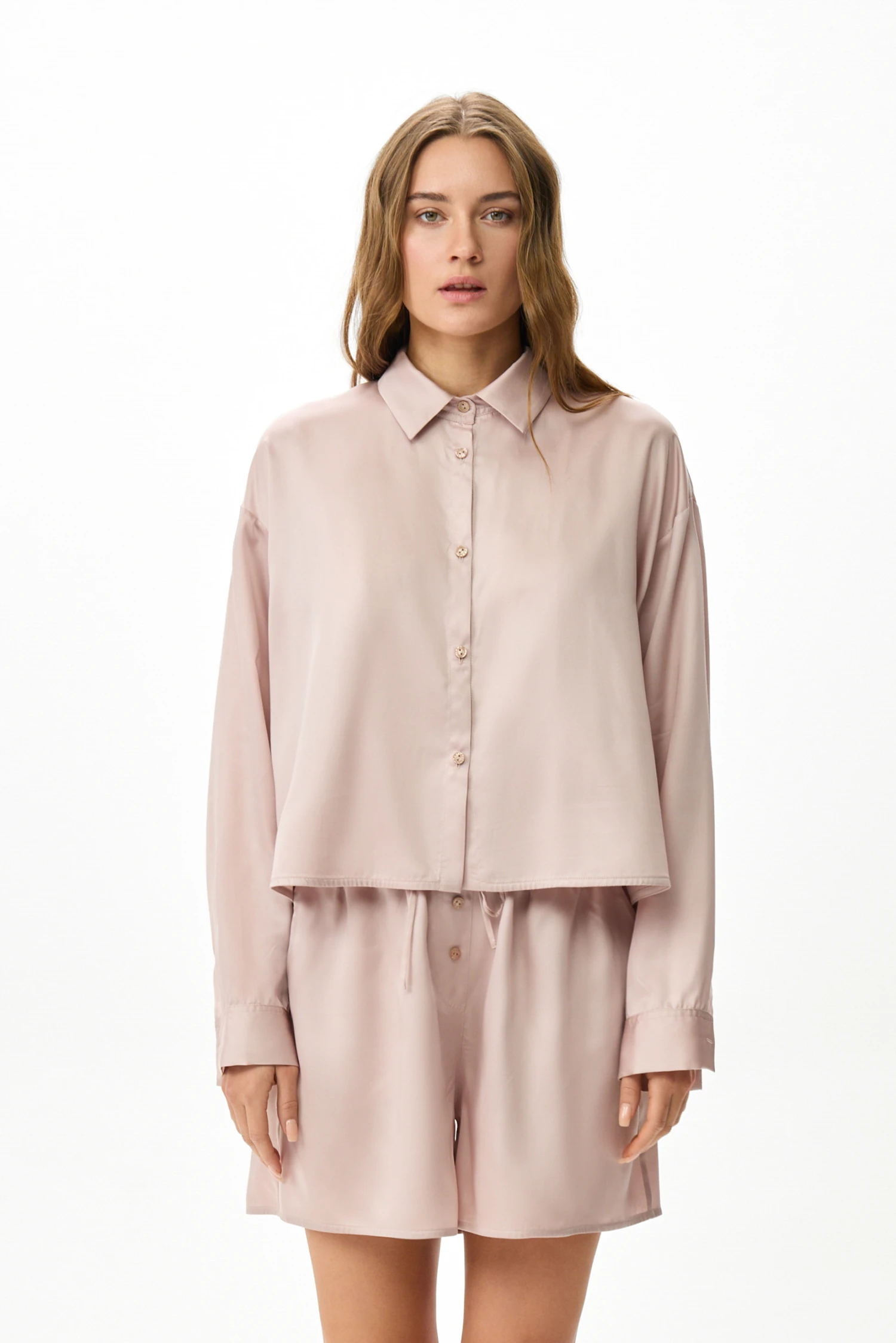 Пижама Wide Crop Nude — символ нежности и тщательно продуманного комфорта. Свободная короткая рубашка в сочетании с боксерами создаёт расслабленный, современный силуэт, подчёркивающий естественную изящность и обеспечивающий свободу движений. Деликатный пудровый Nude легко вписывается в повседневный гардероб. Размер 40-42, рост — универсальный.
