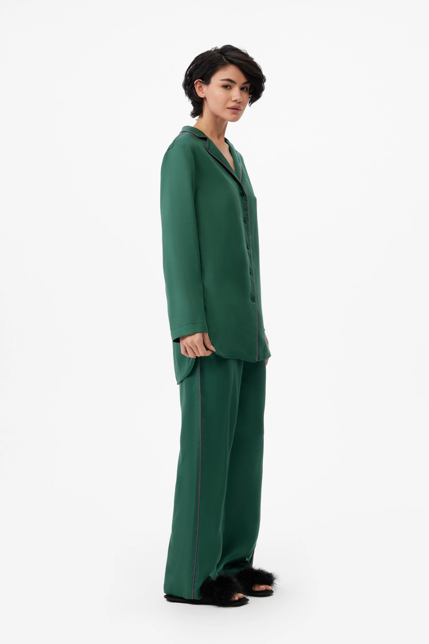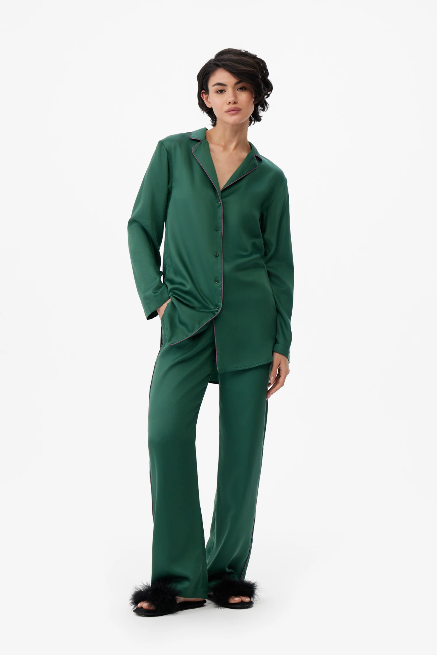 Удлинённая рубашка с аккуратным кантом легко выступает самостоятельной деталью — для спокойных прогулок, сдержанного офисного casual или романтического комплекта в отпуске. Брюки оснащены удобными карманами и надёжной широкой мягкой резинкой, обеспечивающей комфорт при домашних делах, отдыхе или лёгкой йоге. Глубокий темно-зелёный оттенок придаёт комплекту благородную глубину и прекрасно сочетается с нейтральными аксессуарами.