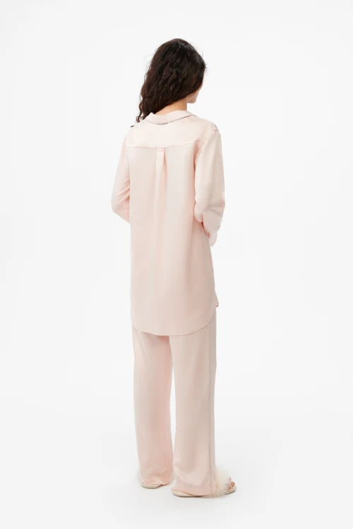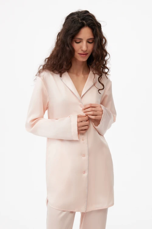 Персиково-розовый оттенок придаёт образу мягкую женственность и лёгкую элегантность, легко комбинируется с нейтральными аксессуарами и домашней обувью. Подходит для домашнего отдыха, сна, восстановления после рабочего дня, спа-процедур и поездок, когда важны комфорт и презентабельность.