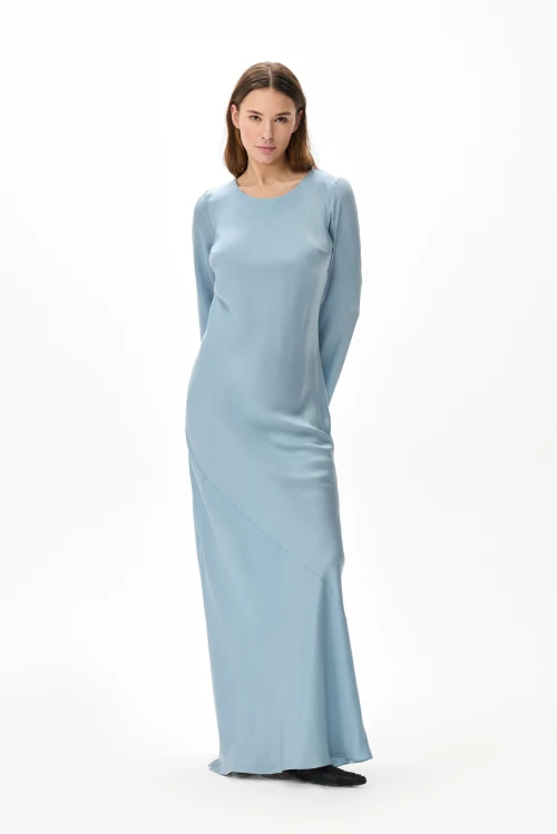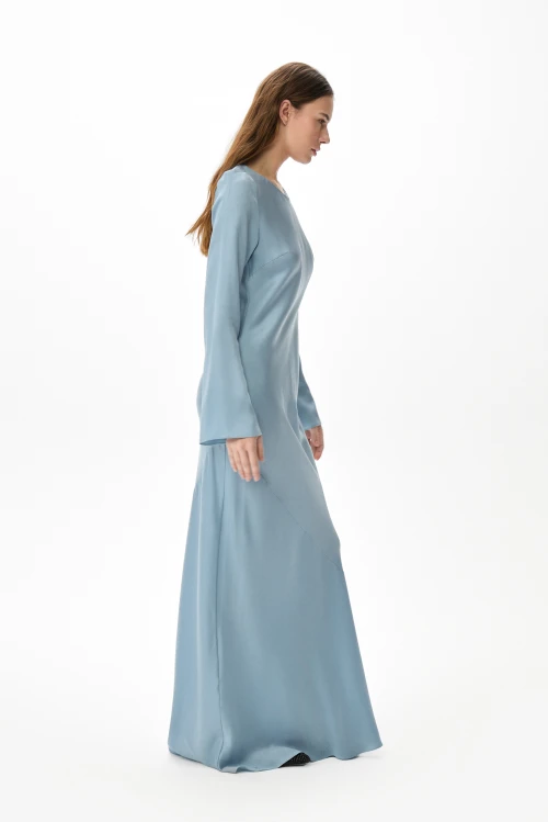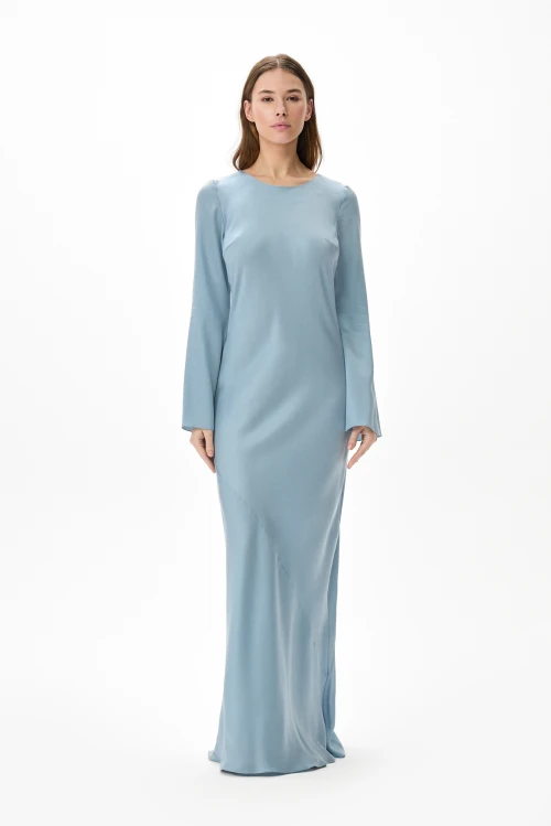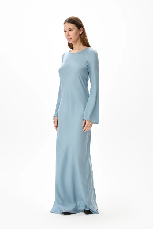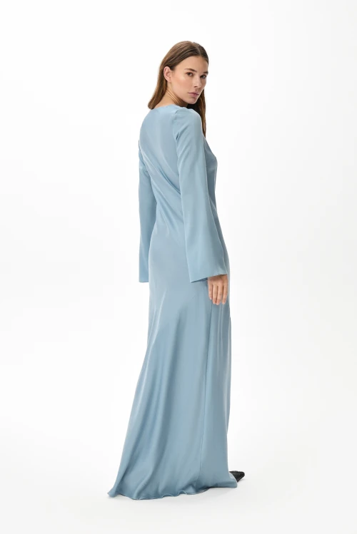 Изящное макси‑платье небесного оттенка из струящегося тенселя сочетает сдержанную элегантность с продуманной практичностью. Косой крой деликатно подчёркивает силуэт и дарит изделию плавную текучесть: платье легко следует за движением, не стесняя жестов. Длинные расклешённые рукава вносят в образ воздушность и выразительность, делая лук завершённым и утончённым. Модель представлена в размере 46, рост 158.