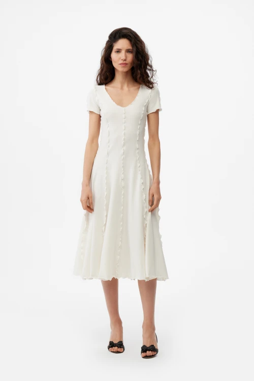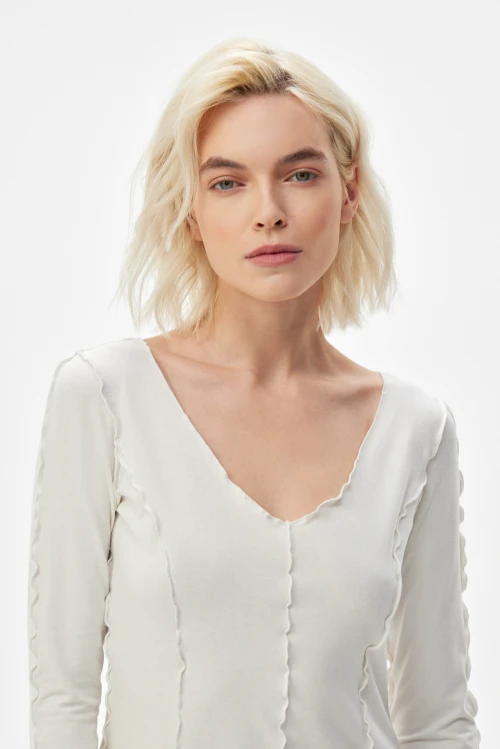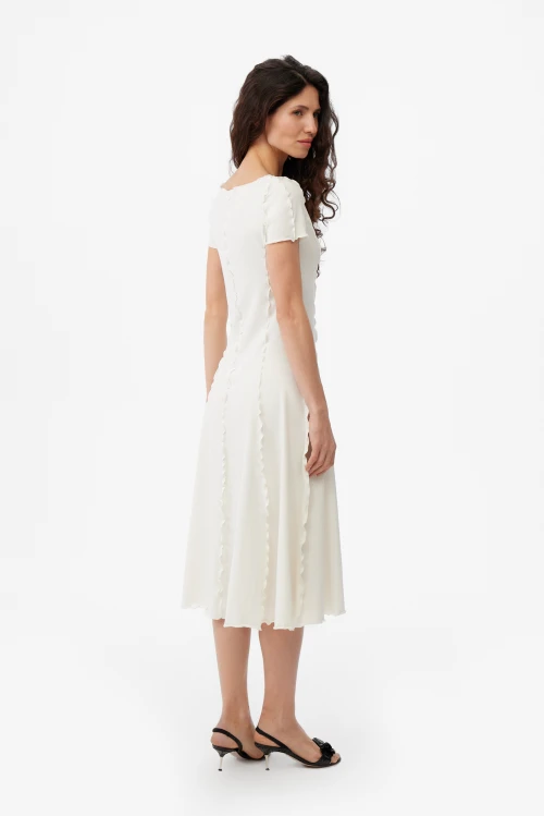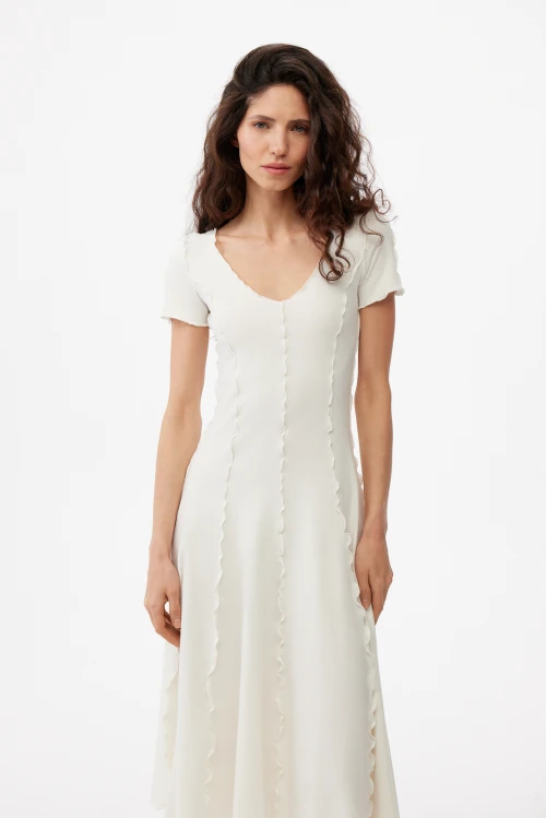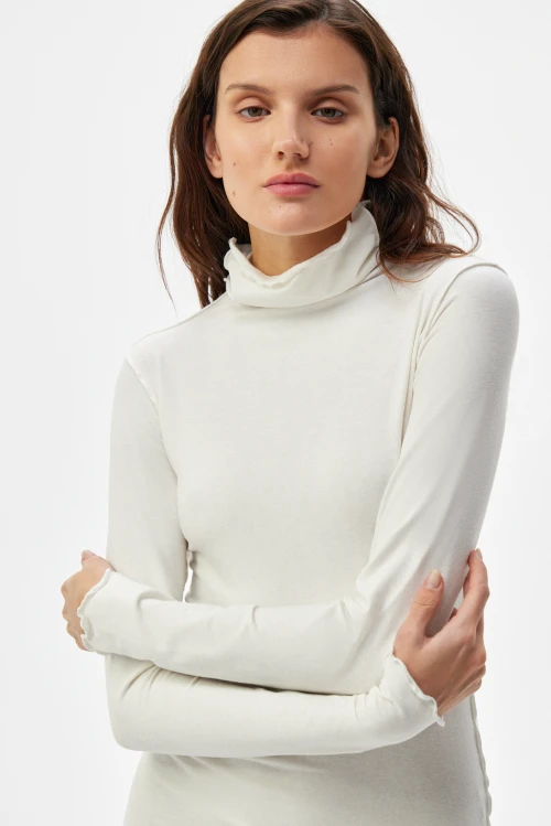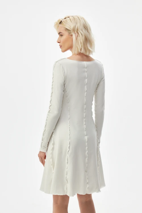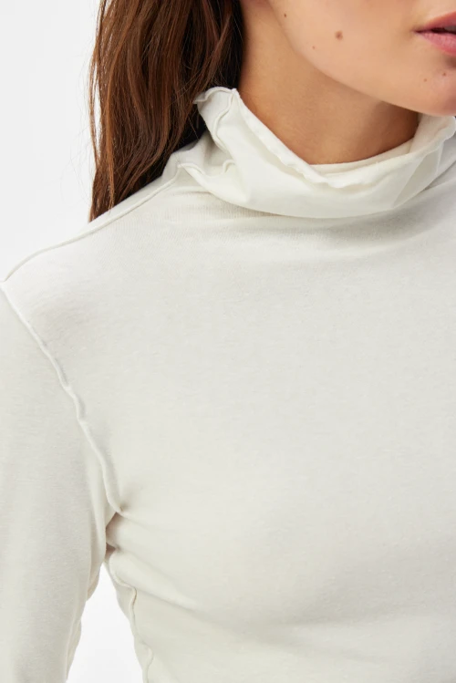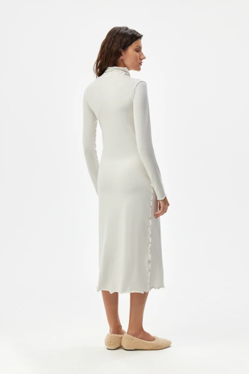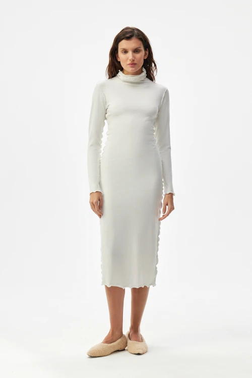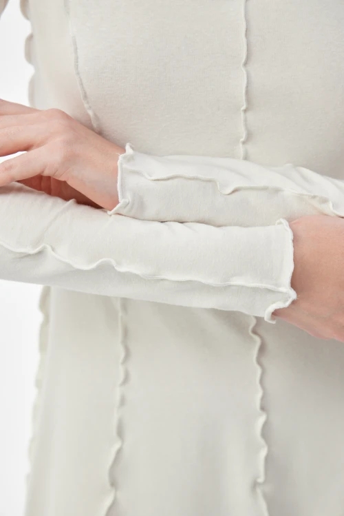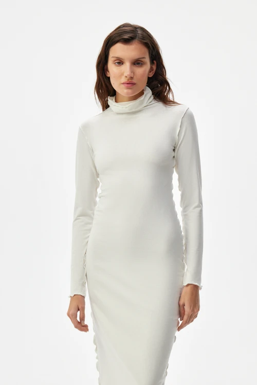 Изысканное платье-водолазка молочного оттенка — современная версия базовой одежды для деловой женщины. Чёткий силуэт и выразительные рельефные швы подчёркивают образ, сохраняя сдержанную элегантность. Ткань — смешанный трикотаж на основе конопли, эвкалиптового тенселя и хлопковых волокон с небольшим добавлением эластана — дарит естественную мягкость, отличную терморегуляцию и приятную тактильность. Модель представлена в размере 50, рост 164.