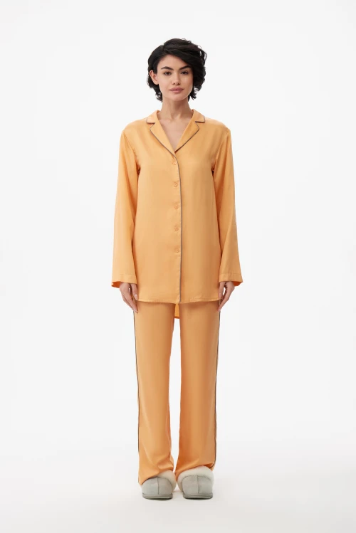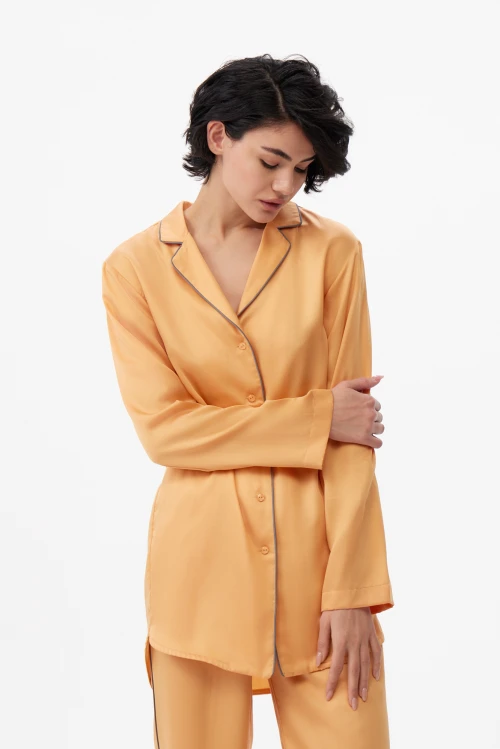 Удлинённая рубашка свободного кроя в тёплом золотом оттенке — сочетание сдержанной элегантности и удобства. Аккуратная кантовая отделка подчёркивает чистоту линий, делая вещь уместной и в деликатном повседневном образе, и в расслабленном домашнем стиле. Носите рубашку как лёгкую тунику самостоятельно или в комплекте с брюками из той же коллекции для завершённого лука. Размер 56–58, рост 164 см.