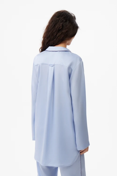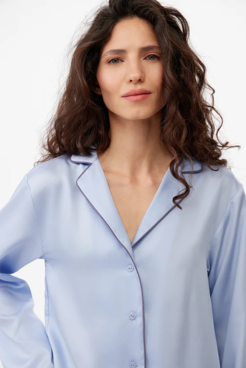 Удлинённая рубашка свободного кроя из мягкого тенселя — удачное сочетание сдержанной элегантности и исключительного комфорта. Небесно-голубой оттенок придаёт образу лёгкость и умиротворение, а аккуратный кант подчёркивает минималистичную изящность. Размер 56–58, рост 170 см.