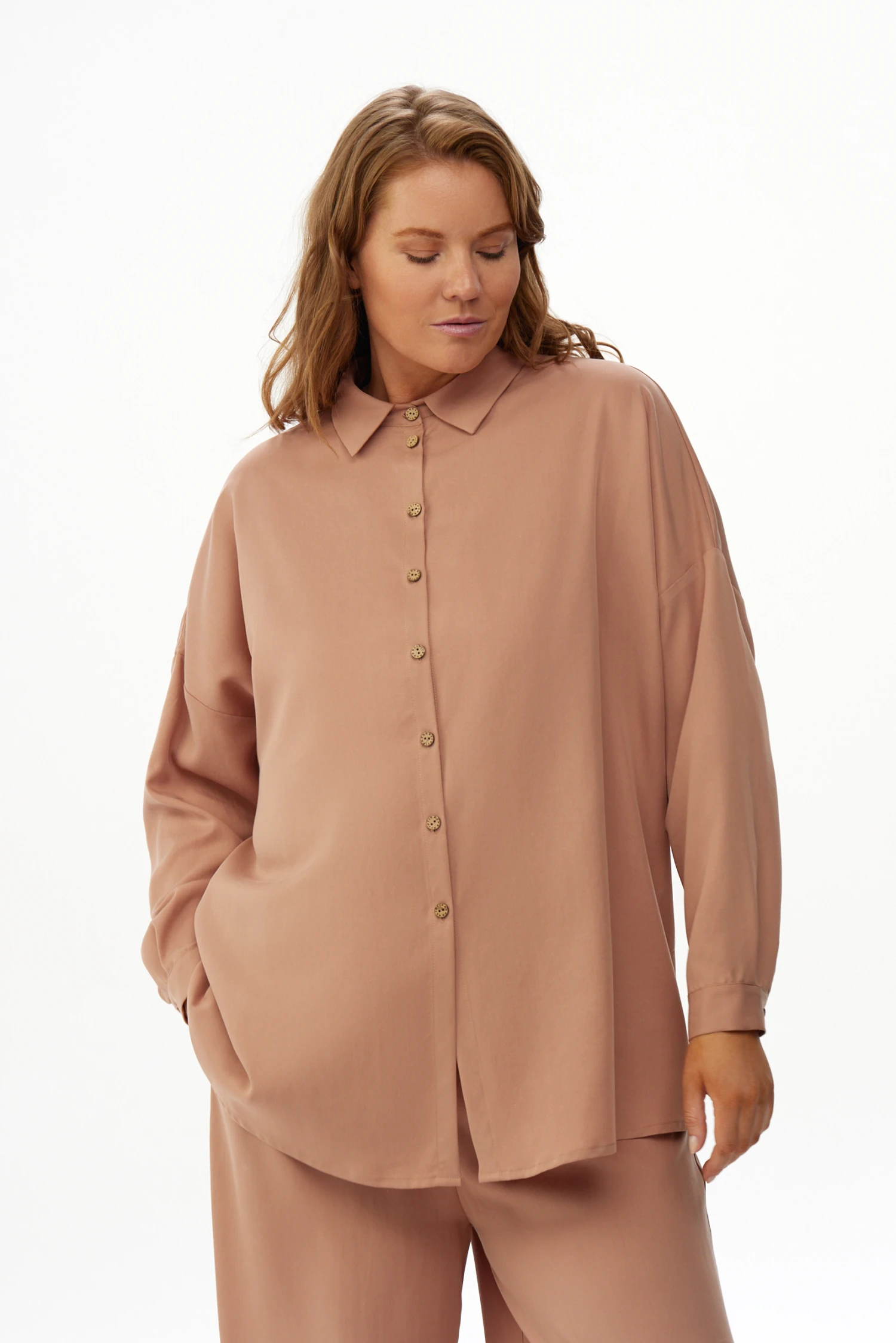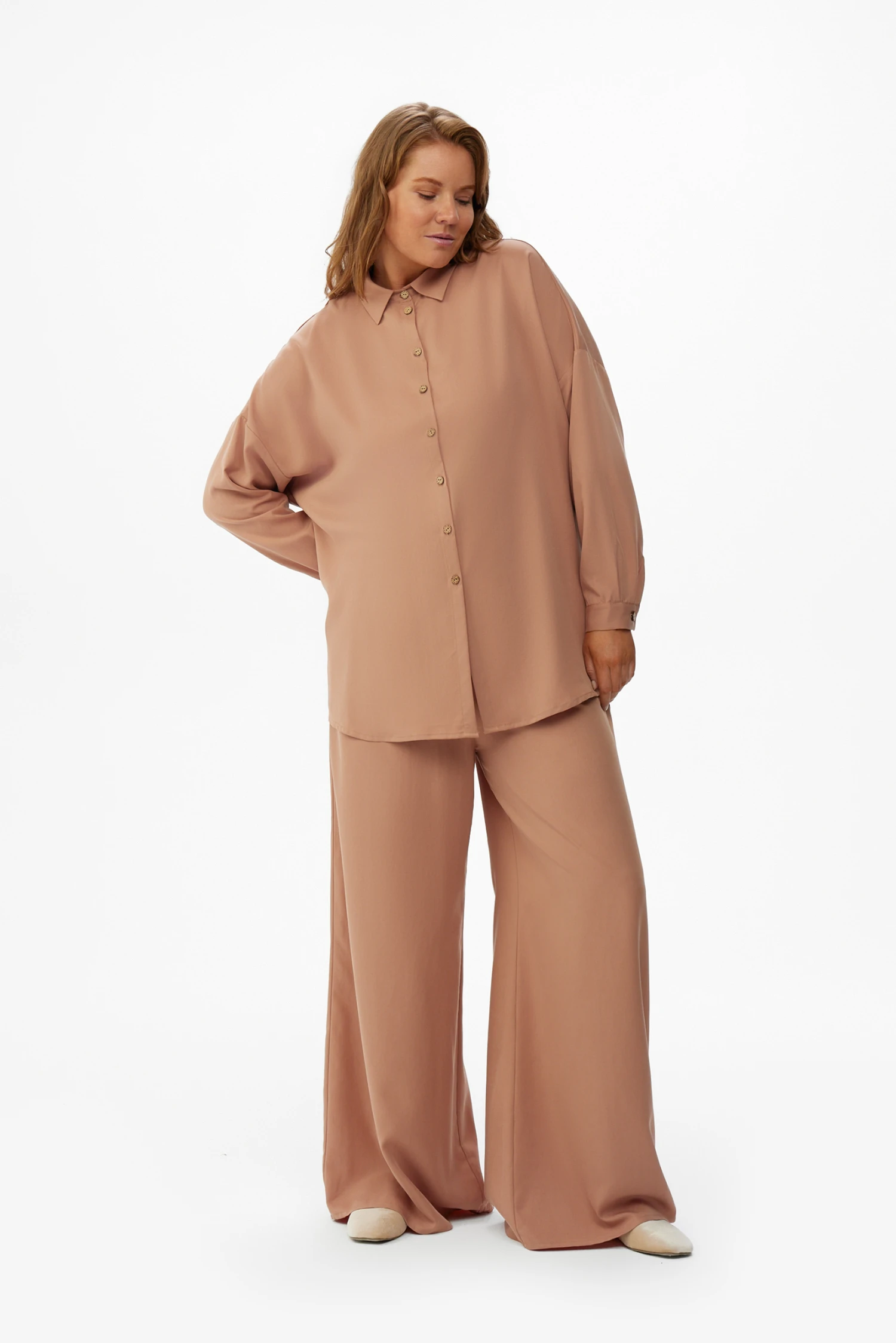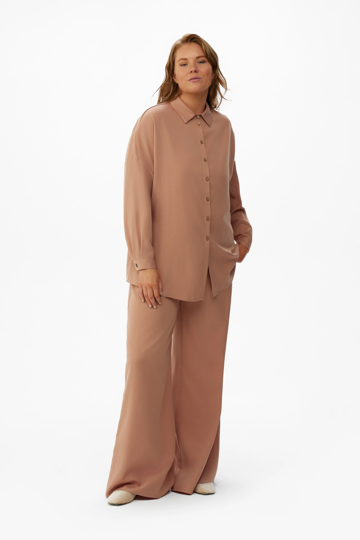 Тёплый беж — универсальная база для монохромных комплектов и мягкое решение для повседневного гардероба современной женщины. Скомбинируйте рубашку с брюками из той же коллекции, чтобы получить сдержанный и продуманный лук, подходящий для офиса, прогулок по городу, деловых встреч и спокойного уикенда.