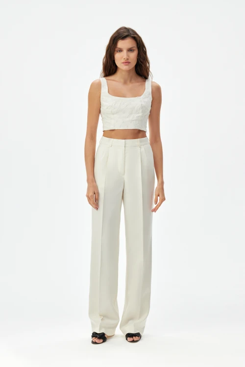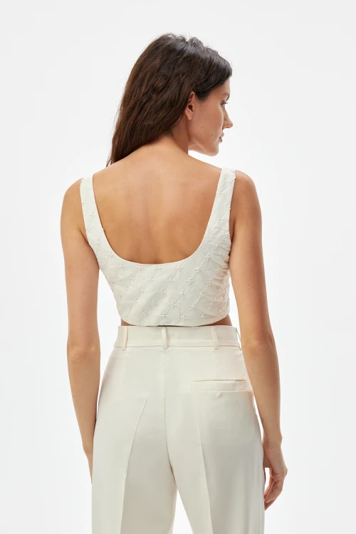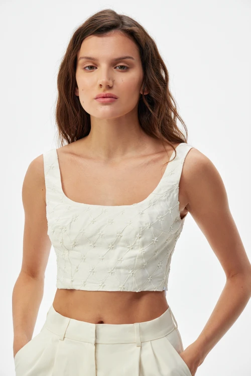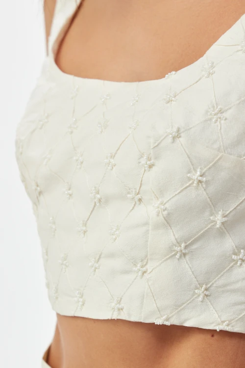 Сдержанный молочного оттенка укороченный топ из плотного натурального шелка — материал сочетает благородный лоск и ощутимую плотность фактуры. Ромбовидная отстрочка придаёт изделию чёткую геометрию, а отделка жемчужным бисером вносит тонкий и сдержанный акцент роскоши. Молочный тон обеспечивает мягкую универсальную палитру, легко комбинируемую с брюками, джинсами и юбками. Модель представлена в размере 44.