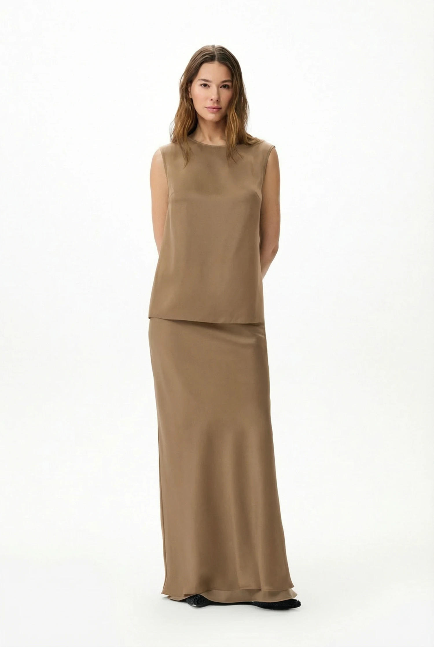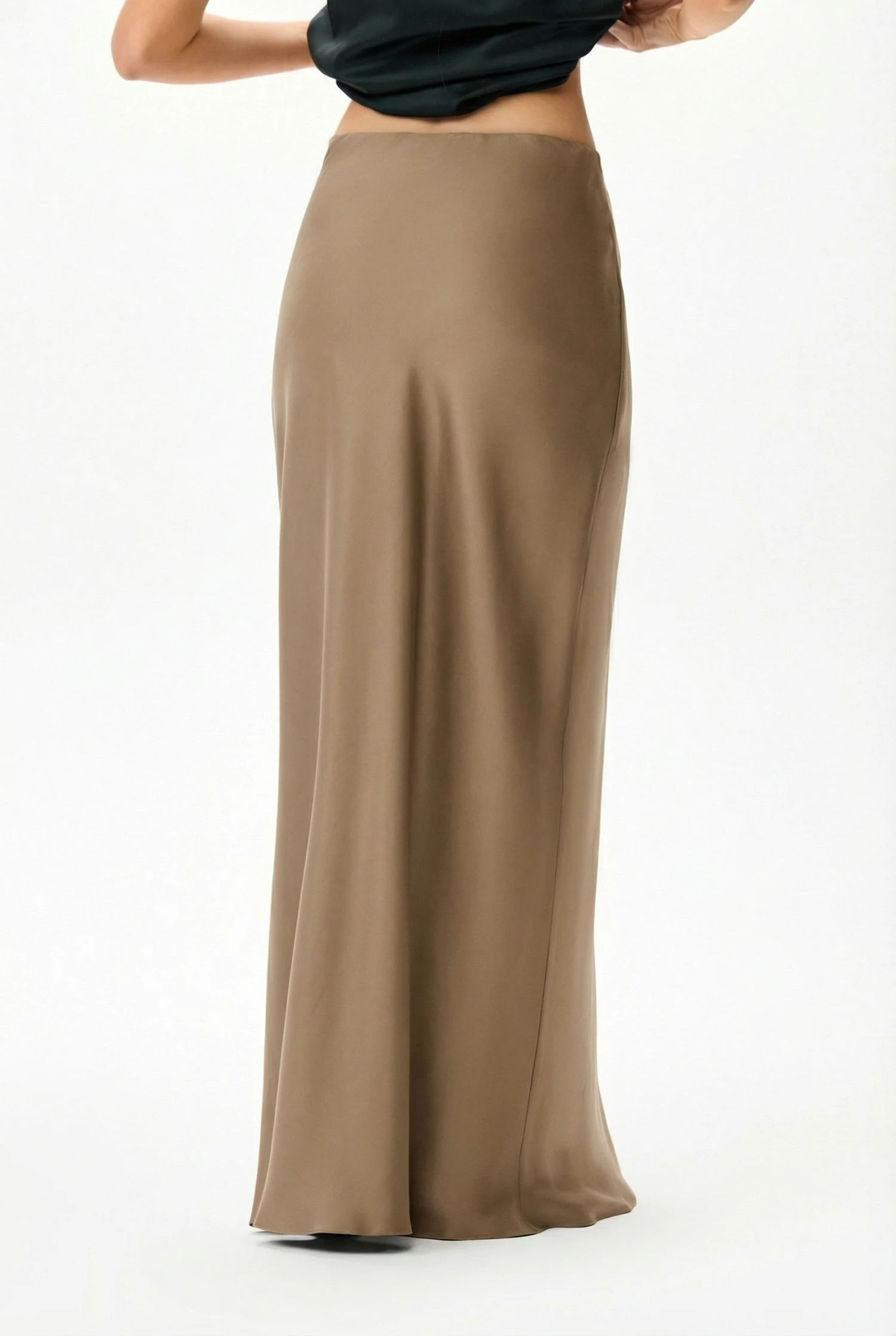 Изысканная юбка из тенселя, кроенная по косой, сочетает утонченный силуэт с продуманной практичностью. Модель представлена в благородном бронзовом тоне и имеет два внутренних слоя — чёрный и графитовый — которые придают плотность и полную непрозрачность, делая цвет глубже и более рельефным. Благодаря продуманной конструкции изнанка скрыта между слоями, что обеспечивает аккуратный вид и долговечность изделия. Размер 42, рост 158–164.