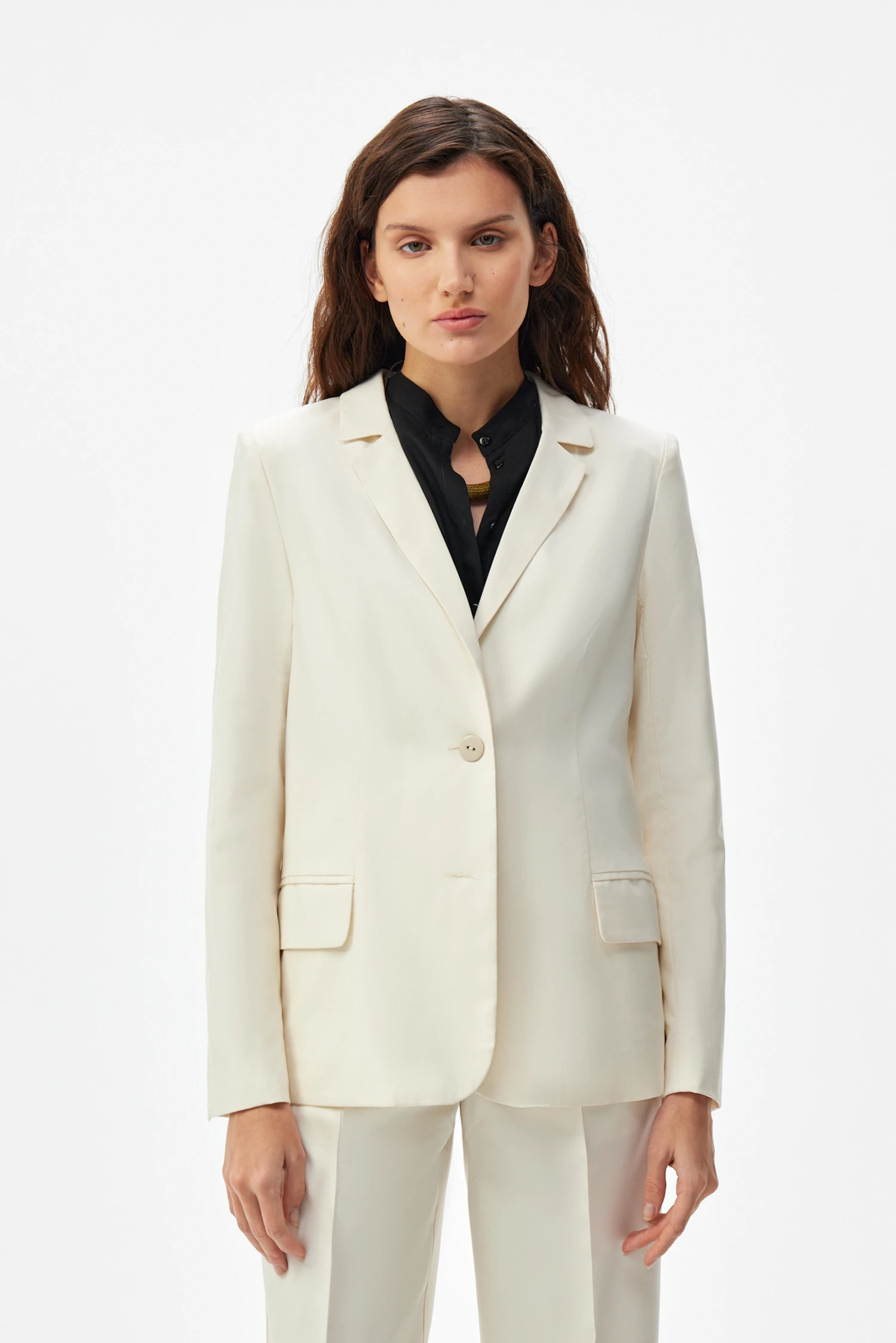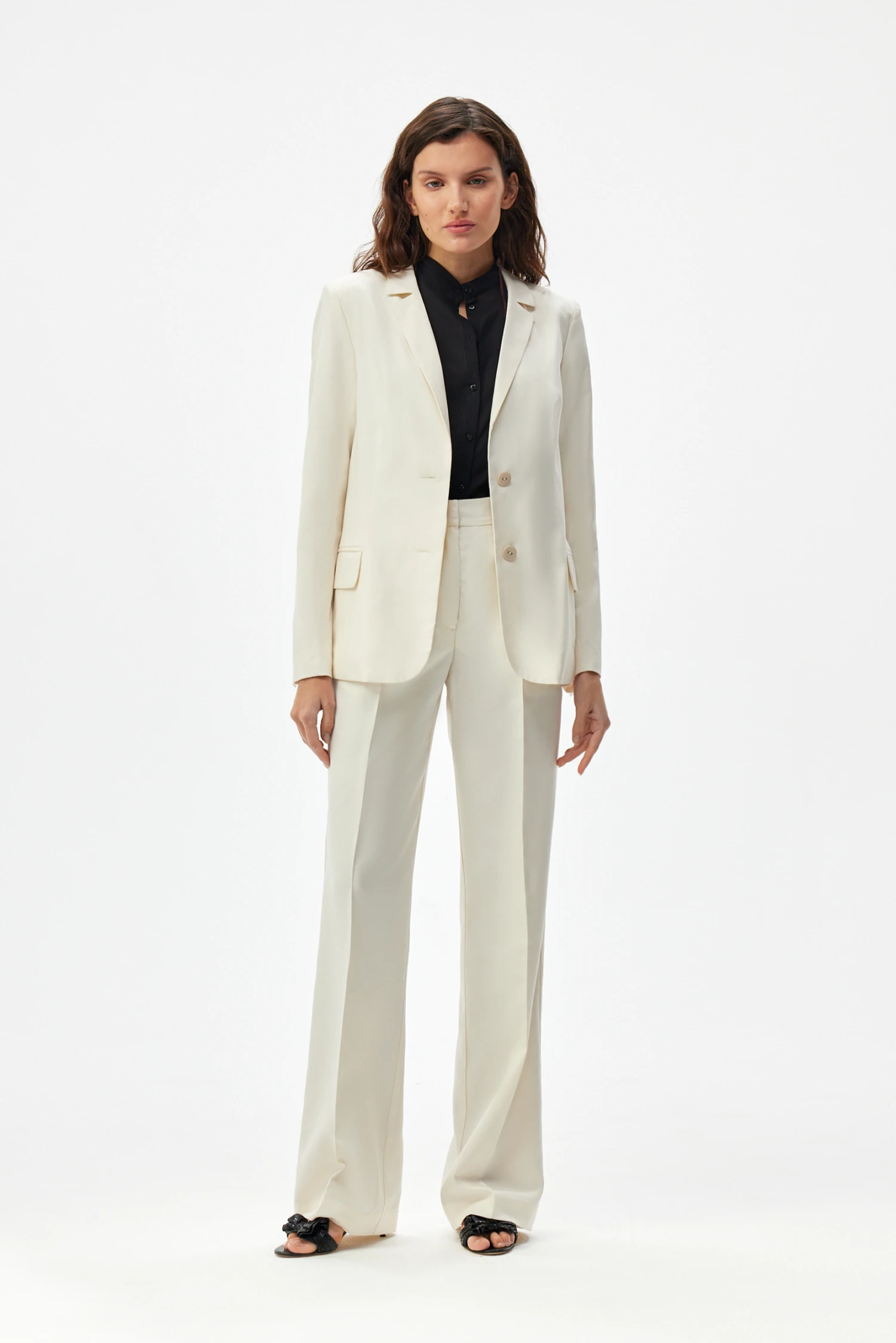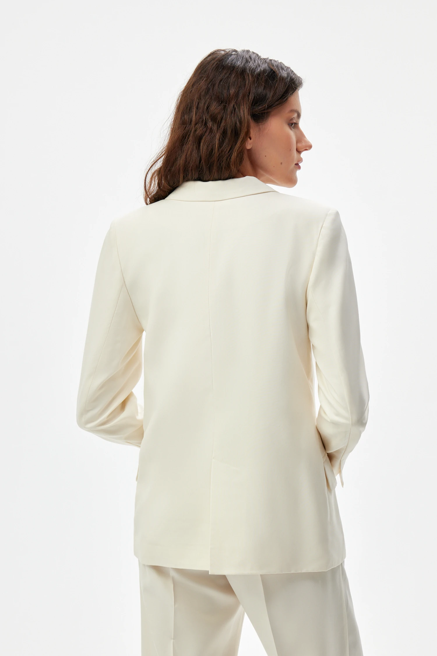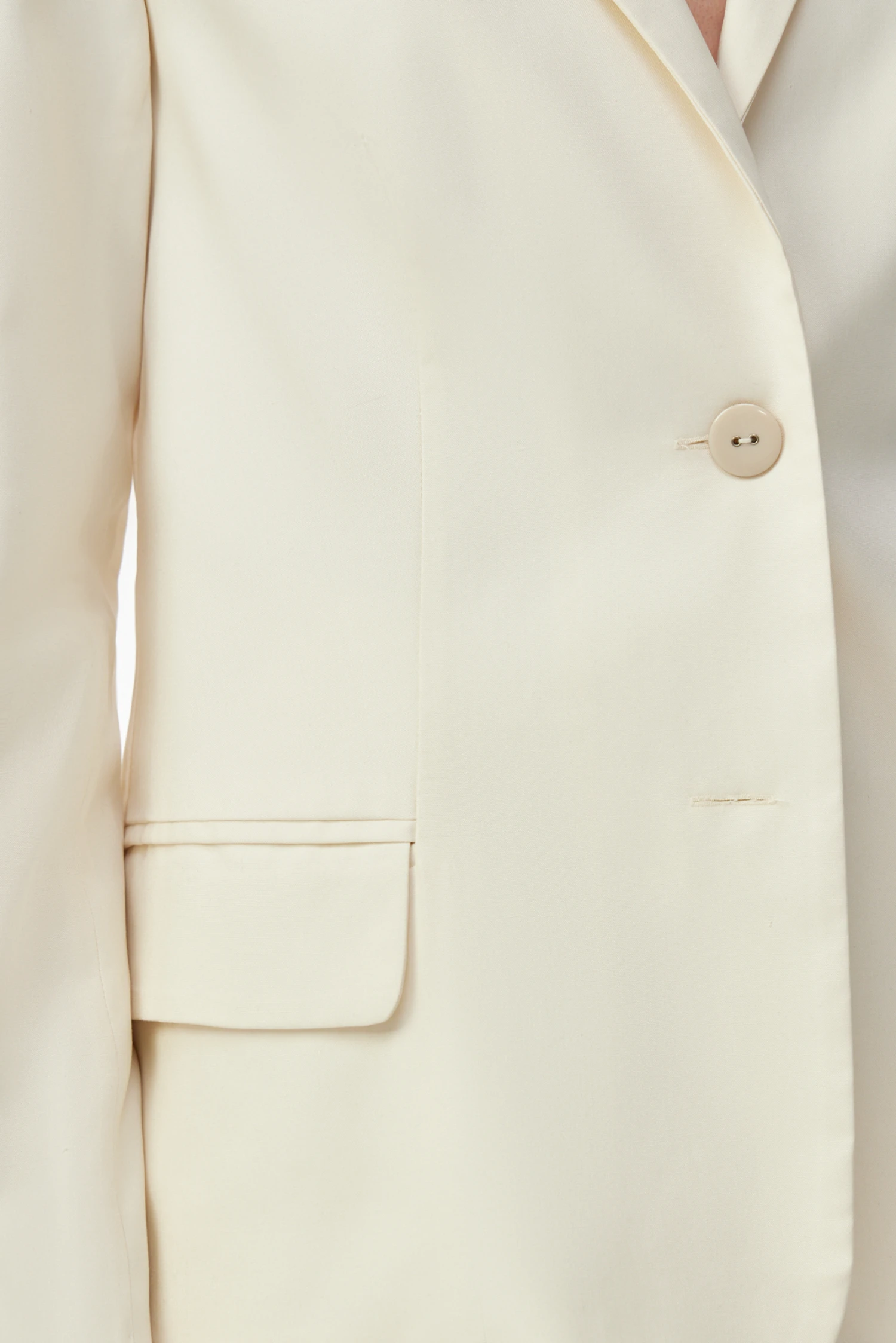 Сдержанный крой делает жакет универсальным решением для разных случаев: деловые встречи и завтраки, прогулки и культурные мероприятия, вечерние выходы и торжественные обеды; также модель удобна в поездках и в отпуске как лёгкий внешний слой. Светло-молочный тон легко комбинируется как с монохромными, так и с контрастными образами, подчёркивая чистоту линий и утончённость стиля.